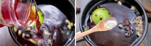 Готовить глинтвейн в домашних условиях рекомендуется в два этапа. Сначала в посуду наливается вода из общего количества использованного сока. Затем положить в воду все специи и добавки, довести до кипения, варить пару минут и снять с огня. Следующим шагом добавляем мед или сахар до полного растворения и вливаем сок.