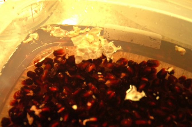 - Самый простой способ очистить гранат — это сделать это в чистой миске, наполненной водой. Необходимо гранат разделить на 4 части, опустить в воду и аккуратно пальцами выделить косточки плода.