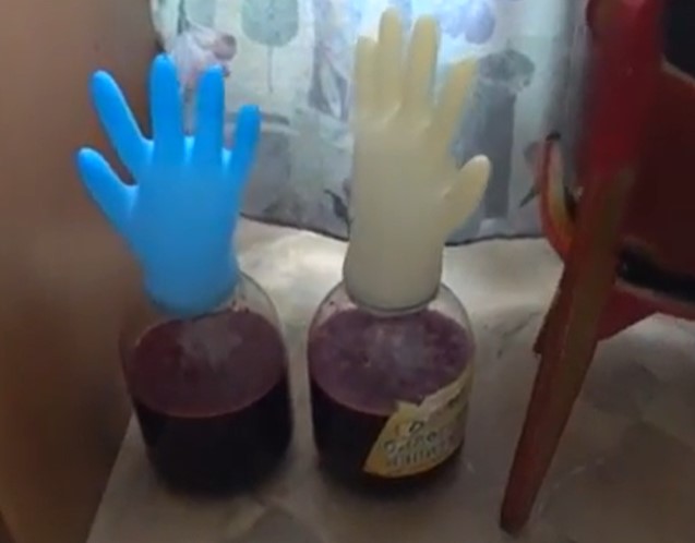 Дырку в перчатке проделывают не сразу, а когда она уже немного вздулась. Так вы будете знать, что процесс идет хорошо, перчатка хорошо закреплена на шее (обычно с помощью резиновой ленты за деньги) и не пропускает воздух. То есть кислород не попадает в бутылку и не испортит вино, превратив его в уксус. При турбулентном процессе одного отверстия недостаточно и можно проткнуть иглой еще одно или два.