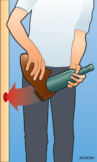 Чтобы откупорить бутылку, достаточно иметь под ногой ботинок, а где-нибудь поблизости ненужную стену. Есть, правда, один момент: редакционные опыты на спонсорском алкоголе показали, что прием работает, только если бутылка полная.