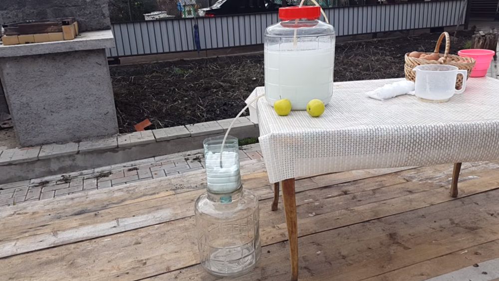 Чтобы не наклонять ёмкость и не выливать лишний белок на фильтр, лучше использовать принцип сообщающихся сосудов. Для этого нам подойдёт любая трубочка (например, силиконовая). Ставим ёмкость со смесью чуть выше пустого сосуда, вставляем трубочку, втягиваем через неё немного самогона и направляем в пустую ёмкость.
