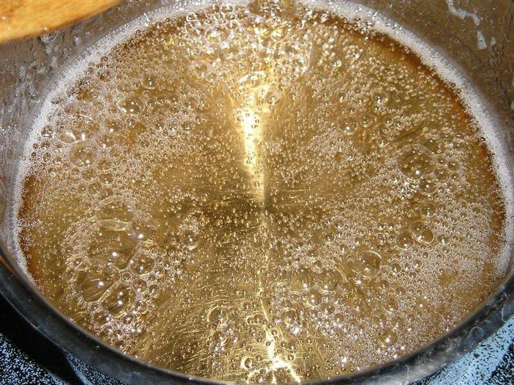 - Выпариваем воду и греем на слабом огне сахар ещё около 15 минут до темноватого янтарного оттенка.