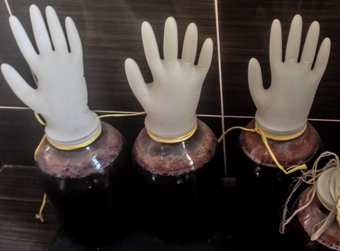 3. Разлить смесь по банкам и накрыть резиновой перчаткой. Сделайте небольшие проколы в одном или двух пальцах. Газ, который выделяется во время брожения, уйдет через них. Банки поставить в теплое место, но не на солнце.