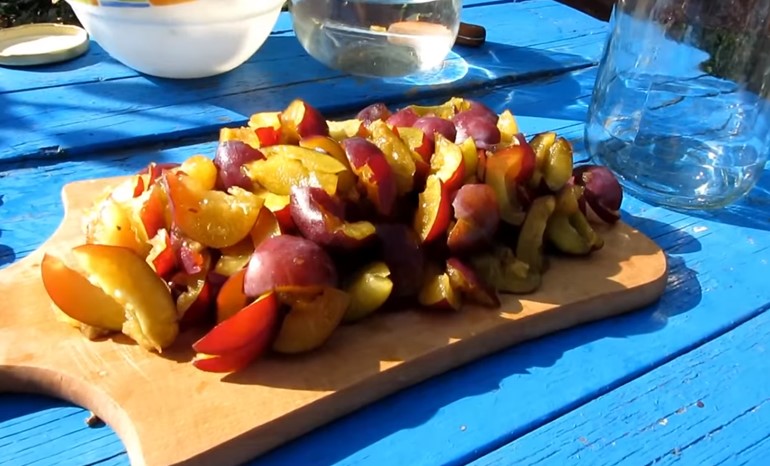 На количество слив берется основная часть, и достаточно нескольких яблок. Так на 1 кг фруктов нужно 80% слив, а остальное — яблоки. Дополнительно на эту гирю берем 1 литр воды и 300 г сахара.
