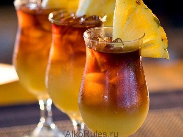 Смешайте ингредиенты и перелейте в высокий стакан, наполненный льдом. Для украшения используйте коктейльную вишню и треугольный ломтик ананаса.