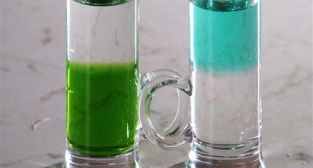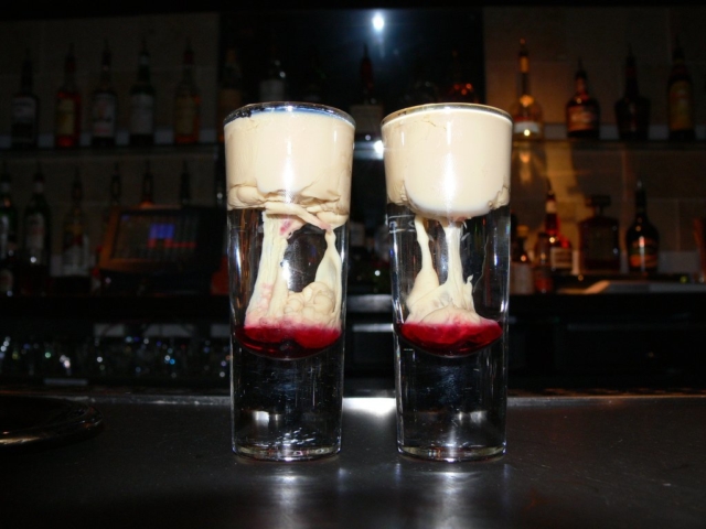 - Спиртовую смесь аккуратно переливают в узкий стакан над апельсиновым соком.