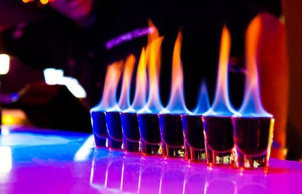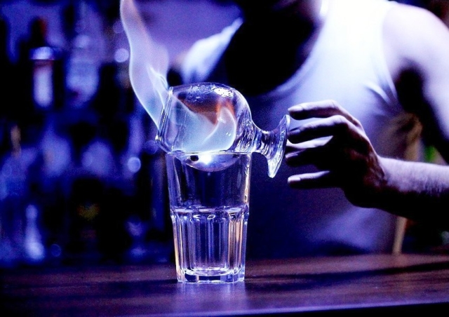 - При горении спирт наливается в стакан с водкой и ликер через лимон.