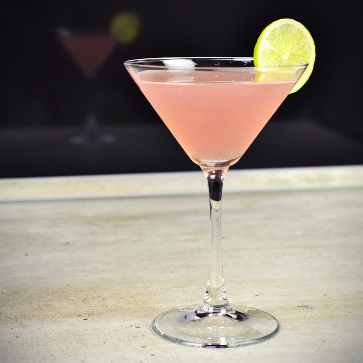 - Готовый коктейль перелить в специальный бокал Martin и украсить долькой лайма.