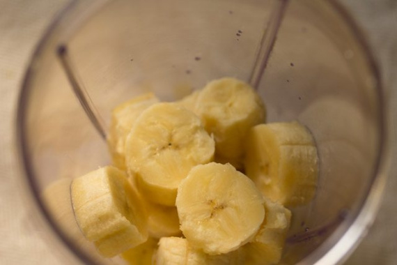 - Очистите банан, нарежьте кружочками и положите в чашу блендера.