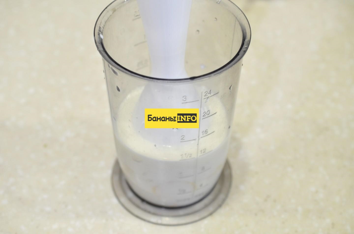 - В чашу помещается блендер, после чего на минимальной скорости ингредиенты взбивают 3-5 минут до появления густой пены.