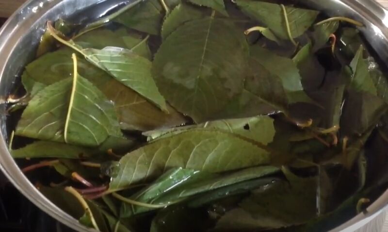 1. Подготавливаем основу — это листья вишни (также можно взять малину, листья смородины). Моем и сушим их. Берем кастрюлю и кладем на нее листья. Наливаем туда воду. Ставим кастрюлю на плиту и варим под закрытой крышкой 10-15 минут после закипания.