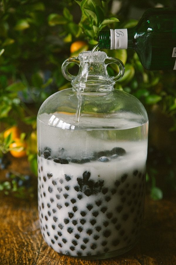 1. В этом рецепте используются замороженные фрукты. Поэтому ягода чистая и складываем ее из пакетов в удобную емкость для полного размораживания. Далее переливаем их в стеклянную бутыль (30 литров). Для этого лучше всего использовать воронку из пятилитровой пластиковой бутылки. Перетекли?