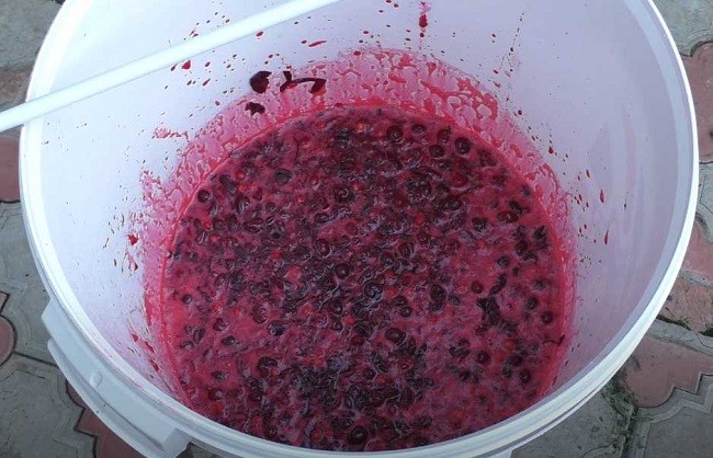 - Залейте ягоды питьевой водой из расчета 1: 1, т.е в этом случае получается 6 литров. Затем перемешайте ягодную смесь и накройте ведро 3-х слойной марлей. Решаем дать вину бродить в теплом месте, лишенном солнечных лучей, на 4-5 дней. За это время произойдет естественная активация дрожжей, начнутся процессы брожения и наверху сформируется мякоть в форме шляпки.