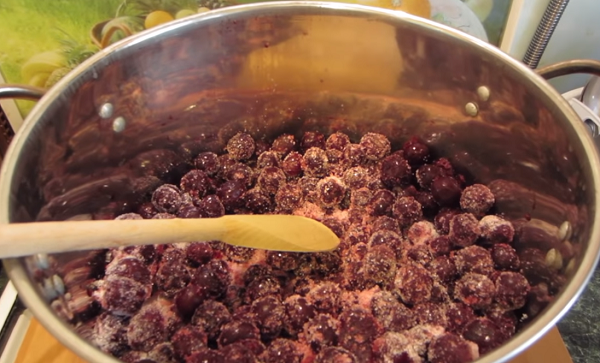 - Переложить замороженные ягоды в кастрюлю, всыпать 1 кг сахарного песка и перемешать. Вишню размораживать не обязательно!
