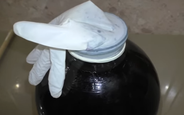 - Надеваем на горло медицинскую перчатку и делаем прокол в одном из пальцев иглой. Емкости с молодым вином ставим в темное место. В начале брожения перчатка набухнет.