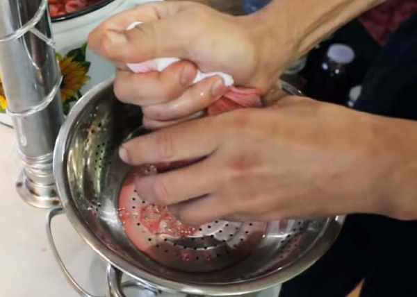 - Затем необходимо процедить сок, чтобы отделить его от мякоти это удобно делать через большое сито, в которое помещается двойная марля.