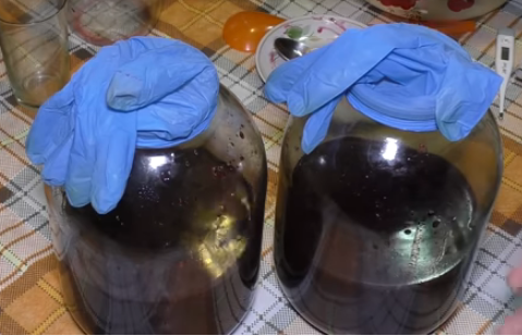 - Нам потребуются медицинские перчатки, которые мы наденем на горло банок и проткнем палец иглой. Это позволит выйти газам, образующимся во время ферментации сусла. Для надежности перчатку дополнительно можно прикрепить к шее тонкой резинкой или обмотать скотчем. Вместо перчатки на банку можно надеть гидрозатвор.