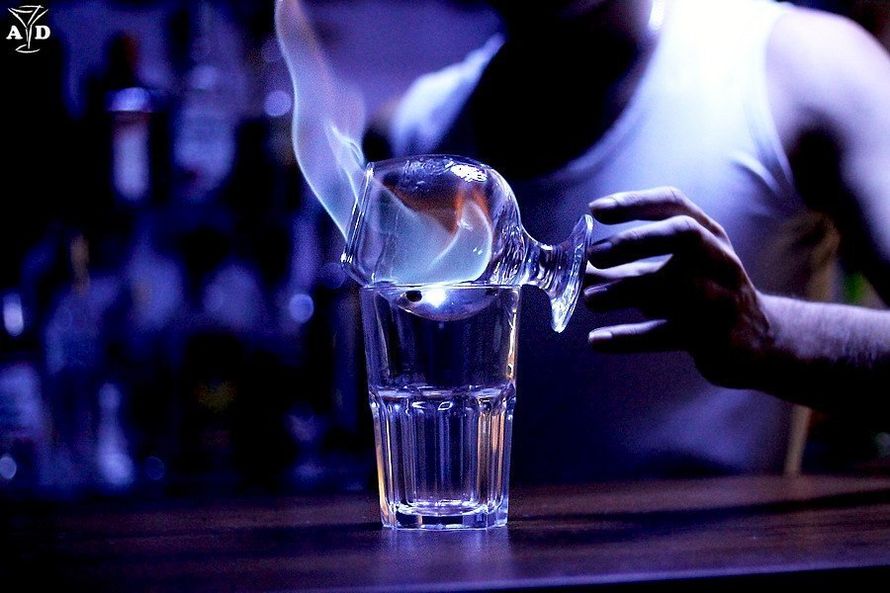 Такой способ особенно популярен у молодежи, которая предпочитает получать удовольствие не только от горячительных напитков, но и от эффекта горения. Данный процесс не требует долгой подготовки и специальных бокалов.